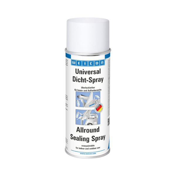 WEICON Allround Sealing Spray is a strongly adhesive, sprayable plastic for the sealing of leaks. It was developed especially for sealing thin cracks and seams indoors and outdoors. It can be used for the sealing of various components, such as gutters, sewage and drainage pipes, caravans, mobile homes, boats, roofs, windows, pool walls, pond foils, cellar shafts and ventilation shafts. Allround Sealing Spray adheres to many surfaces, like stone, metal, plastic, wood, enamel, and many more. The spray is paintable, waterproof and weather- and UV-resistant. It protects metals against corrosion and is free of bitumen and silicone.