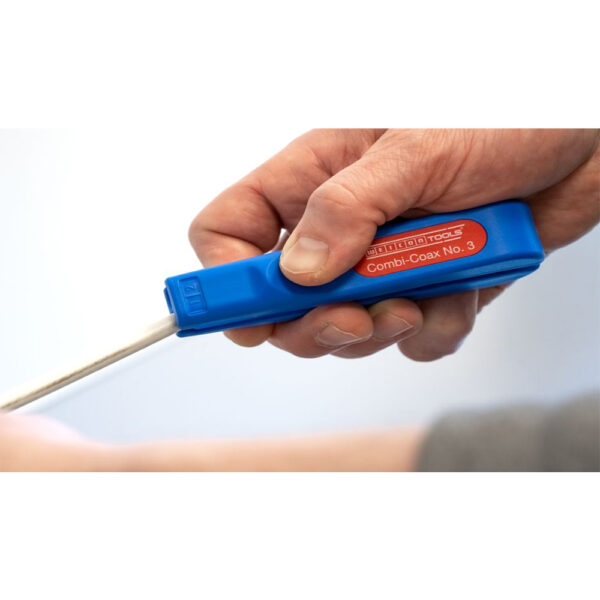 The Combi-Coax No. 3 enables step-by-step stripping of all common coaxial cables, NYM cables and flexible cables. Adjusting the cutting depth manually is not necessary. The Combi-Coax No. 3 strips coaxial cables with a diameter of 4.8 – 7.5 mm, NYM cables of 3 x 0.75 mm² and flexible cables of 10 and 16 mm². In addition, the Combi-Coax No. 3 has an easily accessible side cutter for cables up to 8 mm in diameter. When using the stripper, a precise cutting pattern is shown during stripping. For example, the first sheath of a coaxial cable can be removed with the knife of the stripper on side A. Then the inner conductor is stripped with side B.