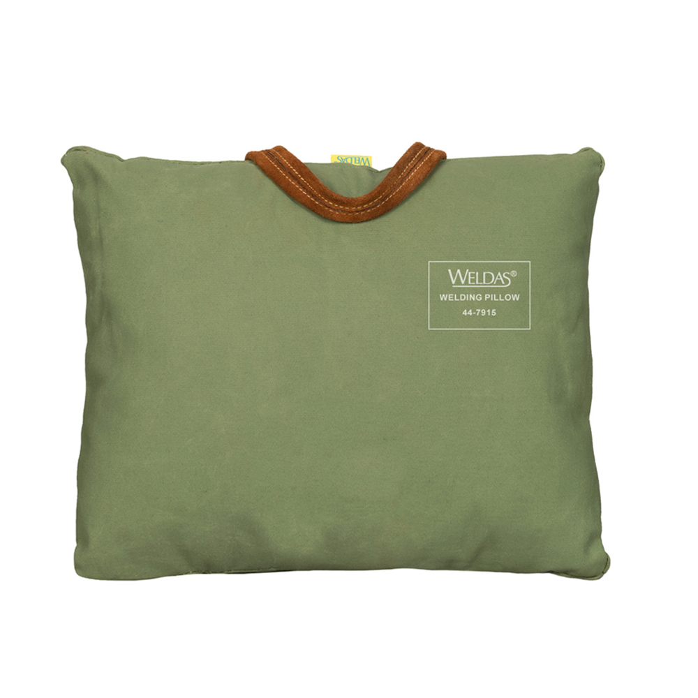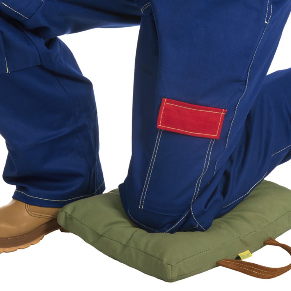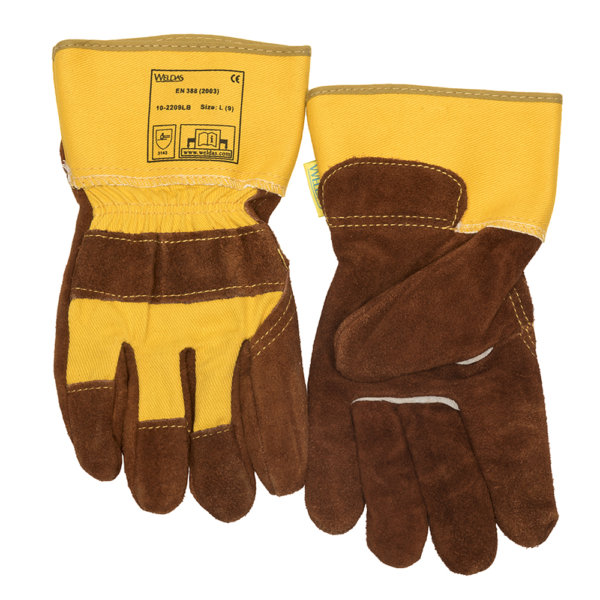 Safety coloured work glove with knuckle strap made of Lava Brown™ split cow leather, lining in the palm and with 7,5 cm safety cuff