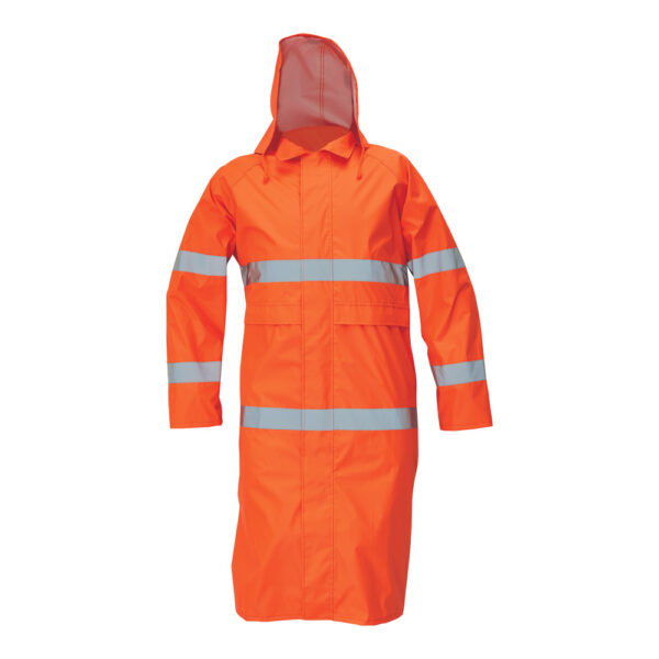 Description: men’s lightweight HI-VIS waterproof coat with an integrated hood and reflective stripes » high water resistance and permeability » zipper closure with velcro flap cover » sleeves with inner elastic cuffs » 2 front pockets with flaps » underarms and back ventilation » taped seams » prolonged length 110 cm.
