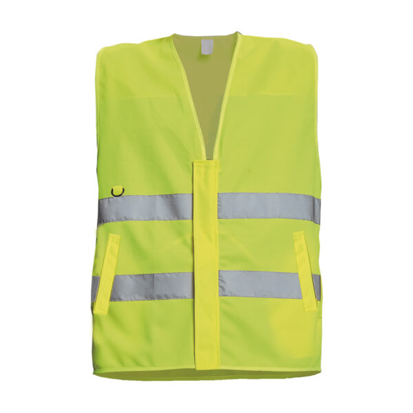 Description:        HI-VIS vest with 2 reflective stripes around waist; zipper closing covered by placket; 2 side pockets.
