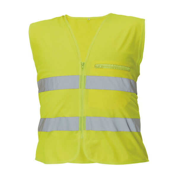 Description: HI-VIS universal reflective vest easily foldable into its own chest pocket » 2 reflective stripes around chest and waist » zipper closure.