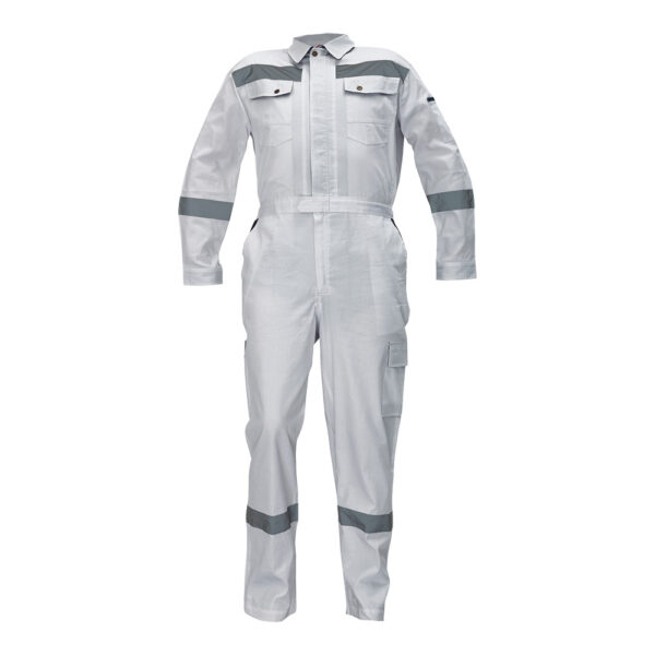 Description: men’s working overall with collar and closure covered by placket, reflective stripes on sleeves and bottom part of legs, side mesh ventilation, 2 front pockets, 1 thigh pocket, 2 chest pockets, 2 back pockets, sleeve popper closing