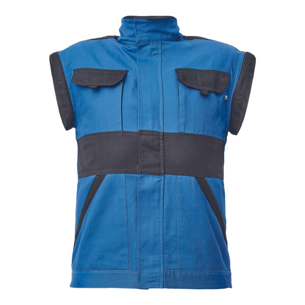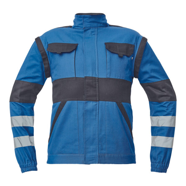Description: men´s working jacket with zipper closure and placket cover; detachable sleeves; 2 front pockets, 2 chest pockets; reinforcement in stressed parts of shoulders and elbows; reflective stripes around sleeves and on bottom back side; elastic cuffs and bottom waist hem.