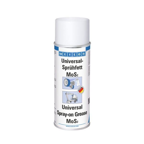 WEICON Universal Spray-on Grease with MoS2 is a high-pressure-resistant and strong long-term lubricant, which reduces friction and wear for prolonged periods of time and is temperature-resistant from -20 to +120°C (-4 to +248°F). Universal Spray-on Grease with MoS2 is suitable for rolling and slide bearings, joints, levers, sliding guides, spindles, camshafts, spline shafts, springs, exposed gears and worm gears. It is suitable for all slide speeds permissible for grease lubrication. Universal Spray-on Grease with MoS2 can be used in the industrial and building sectors, in rolling mills, machine tools, agricultural and construction machines and in road and rail vehicles.