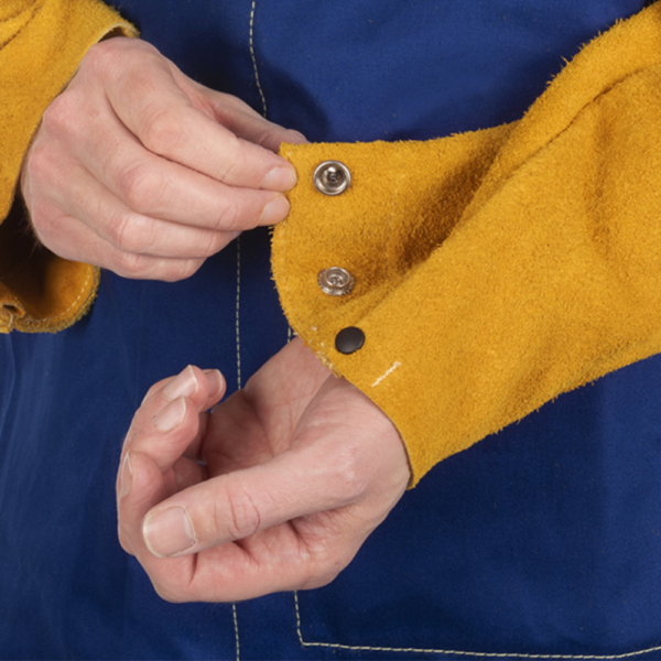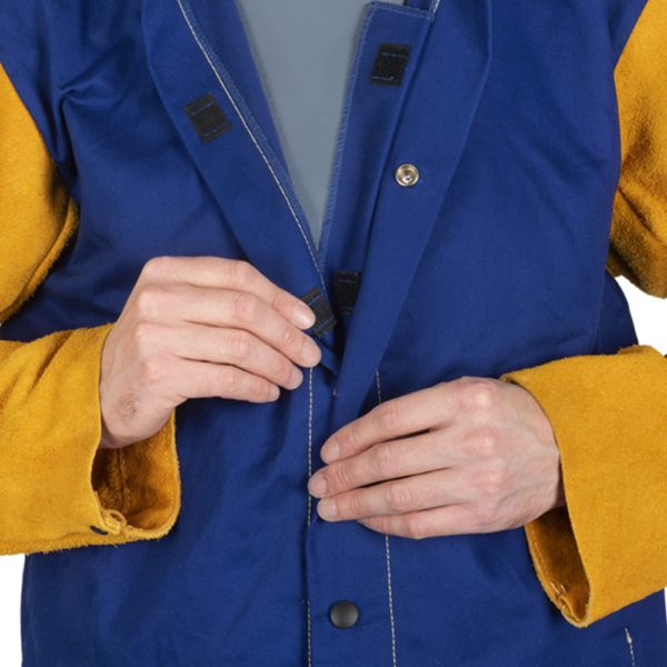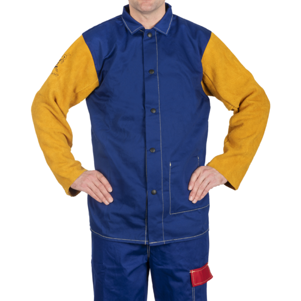 Yellowjacket® blue flame retardant welding jacket with cotton body and yellow split cowleather leather sleeves