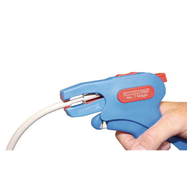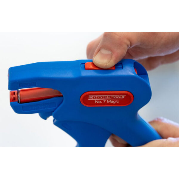 WEICON Wire Stripper No .7 Magic is a robust, ergonomic automatic wire stripper. The automatic scanning system is adjustable to different cable types and diameters with another 5-fold fine adjustment. The fibreglass-reinforced wire stripper has visual length scale from 8 – 24mm. This way, all flexible stranded cables from 0.5mm² – 16mm² and solid round cables from 0.5mm² – 10mm² are efficiently and evenly stripped. The stripper is also suitable for 2-core PVC